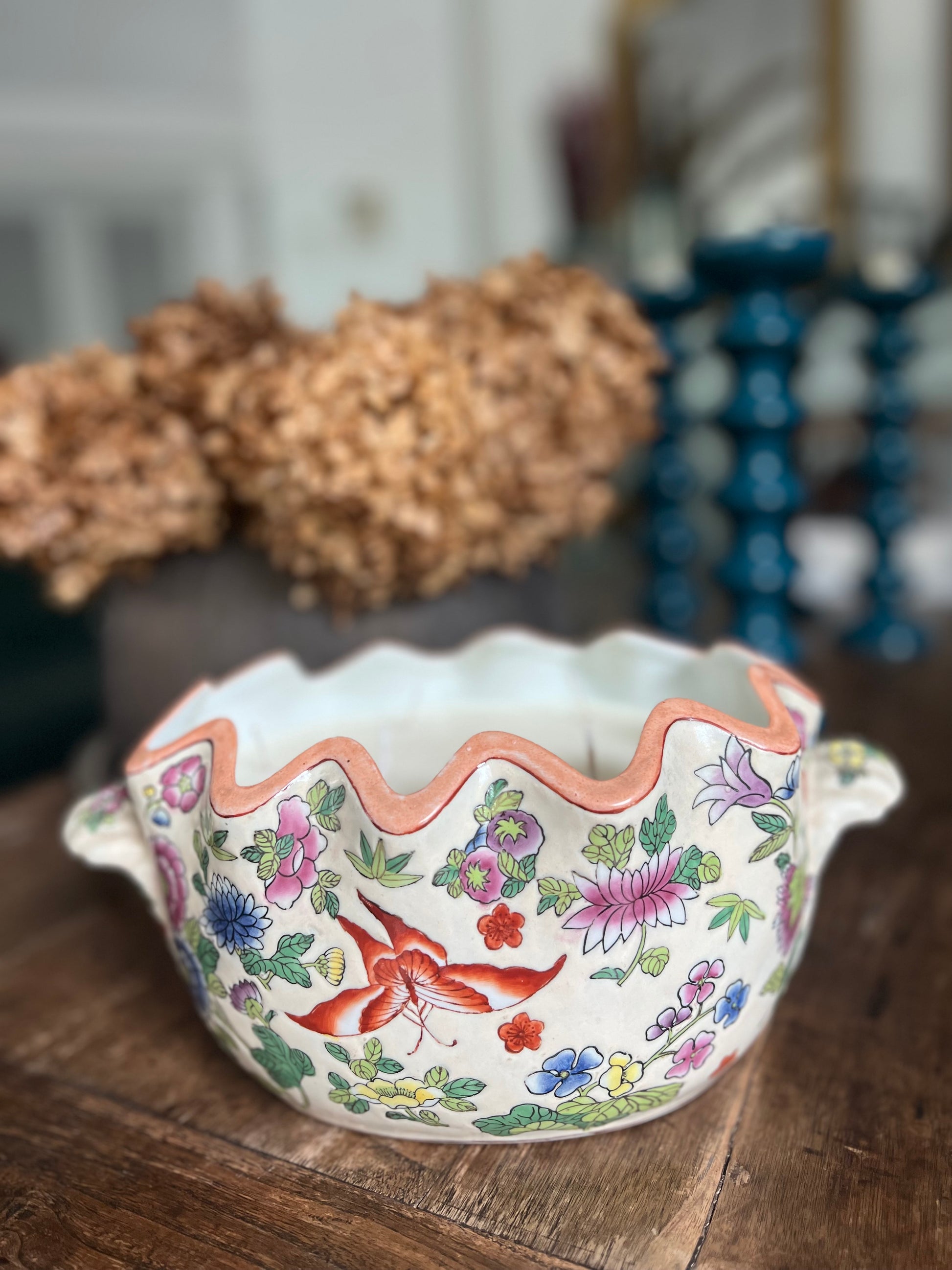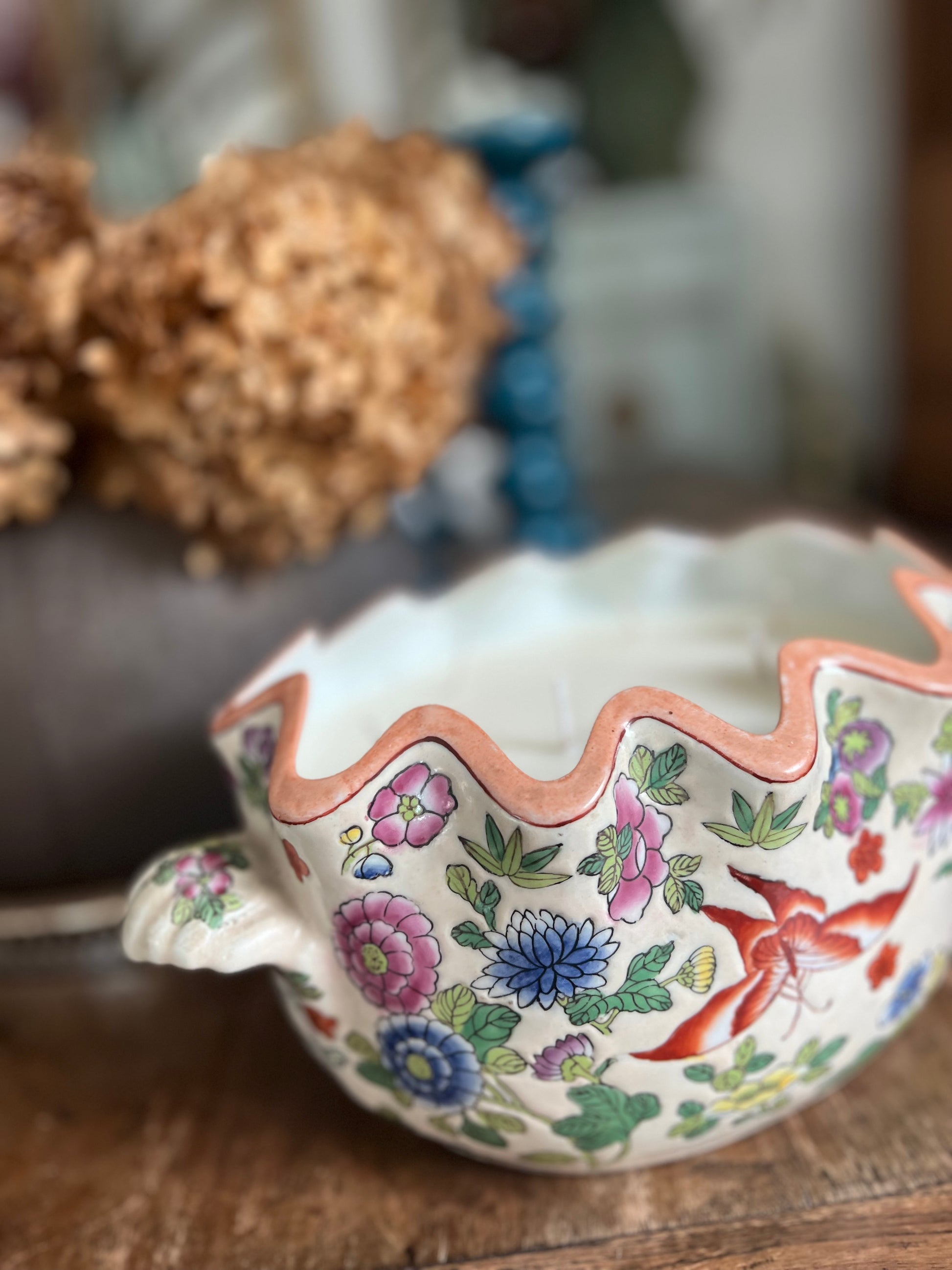 Beautiful hand painted in Hong Kong vessel. It’s been hand decorated in the 1980-90s in HK New Territories. It has a stunning pAstro floral and fauna pattern.
