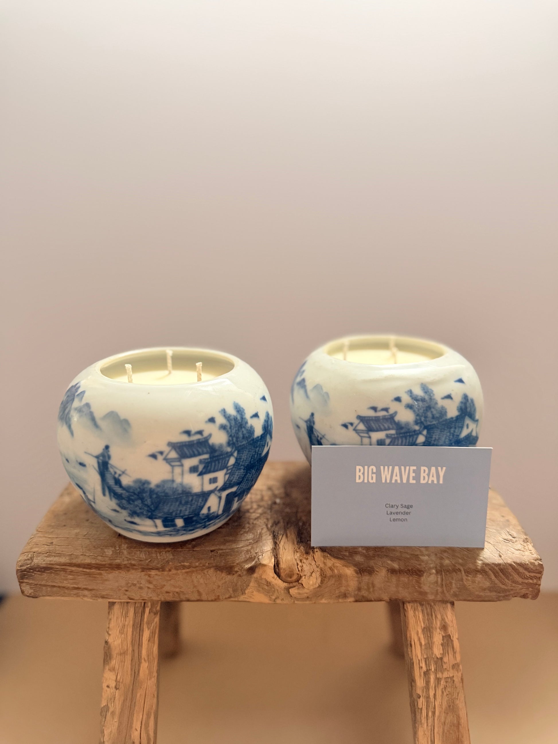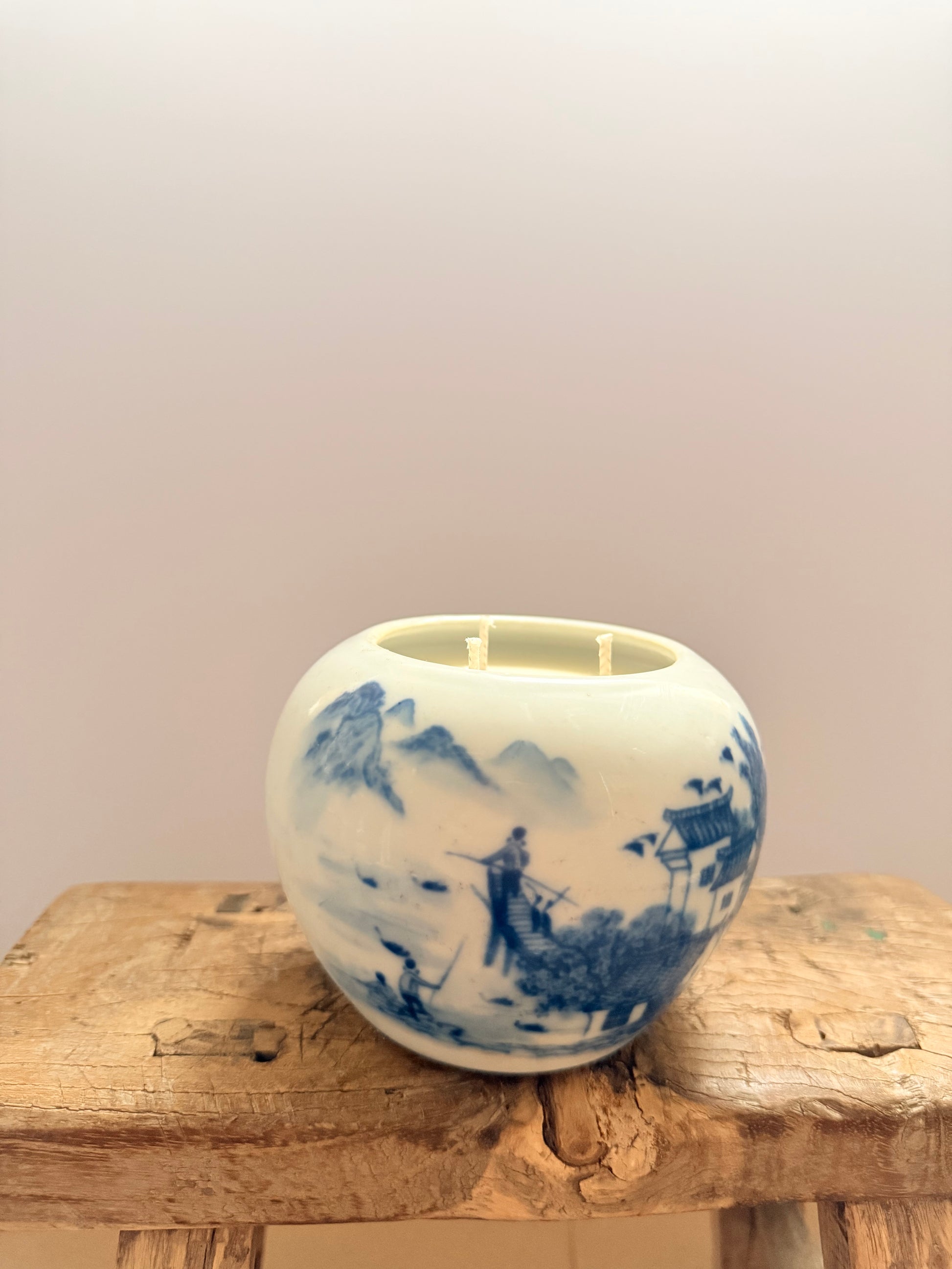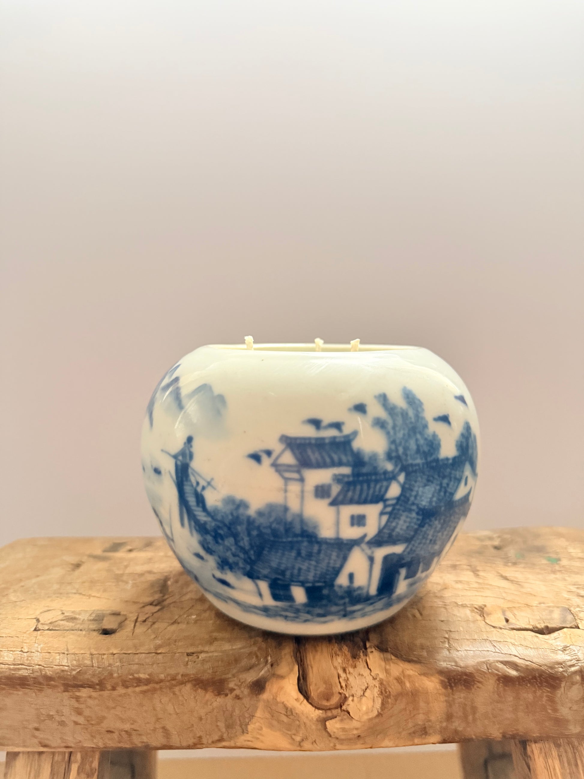 Vintage ceramic small jar, showing a delicate blue and white pagoda countryside scenery, poured as a 1 wick candle. Those jars were used for herbs and condiments.