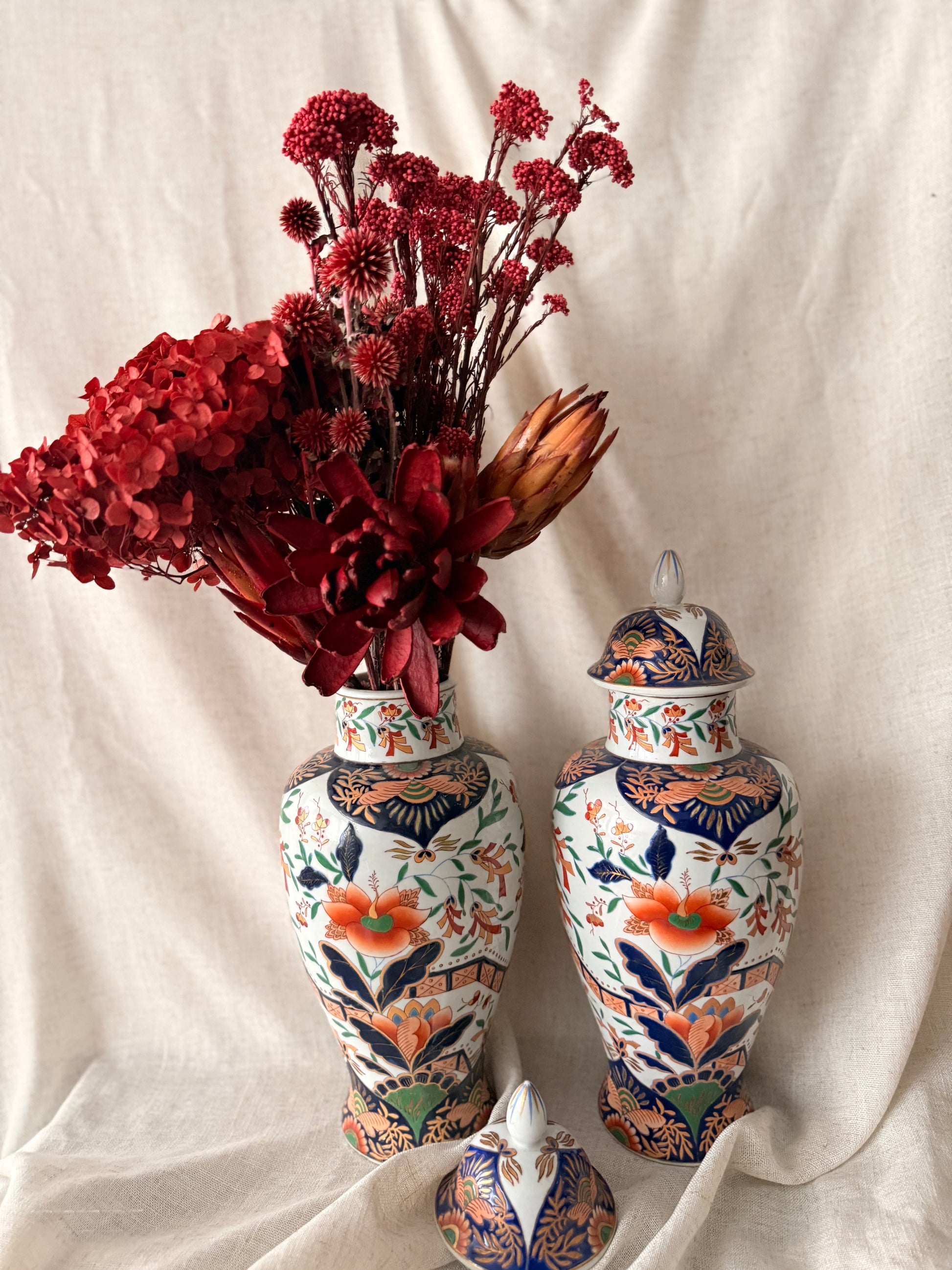 Those stunning Imari style elegant jars have been hand painted in HK prior to the 1990’s. The pattern is sharp and bright, and they’re in a like new condition.