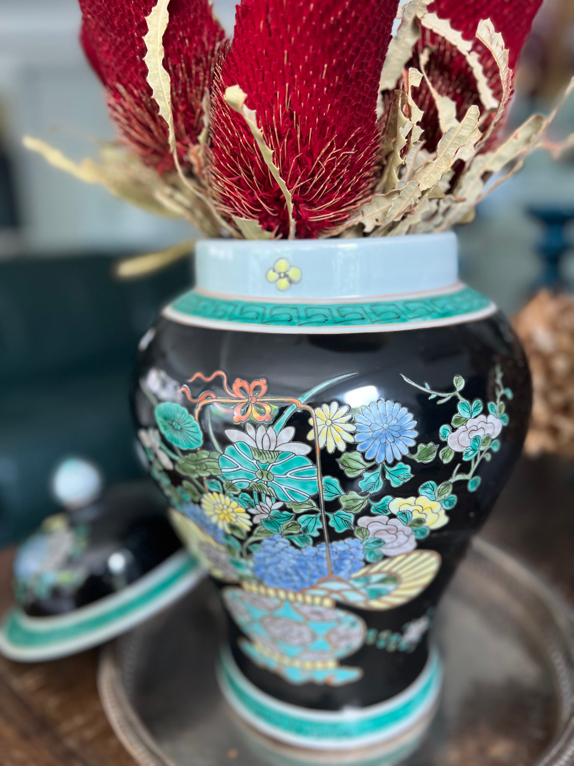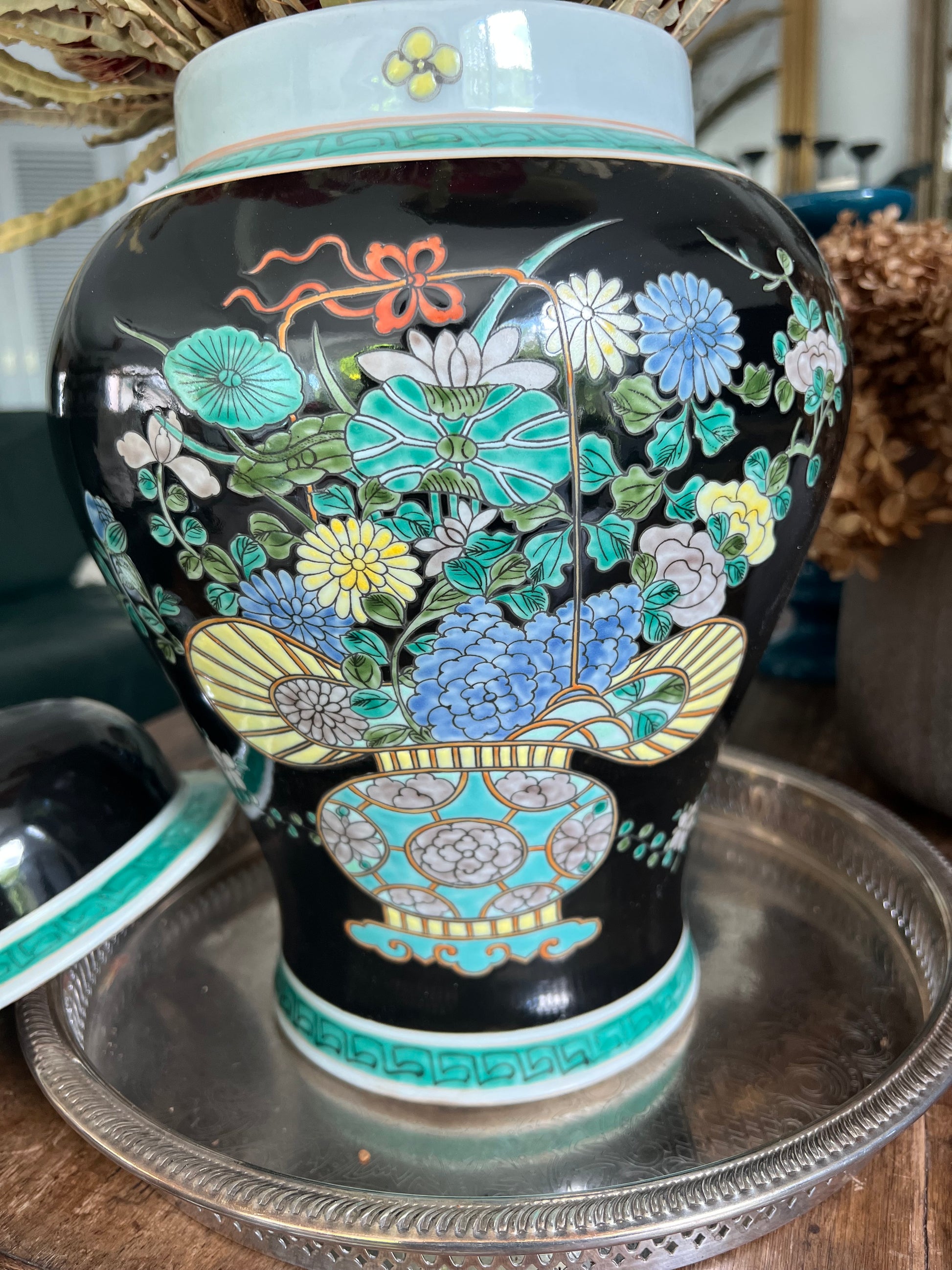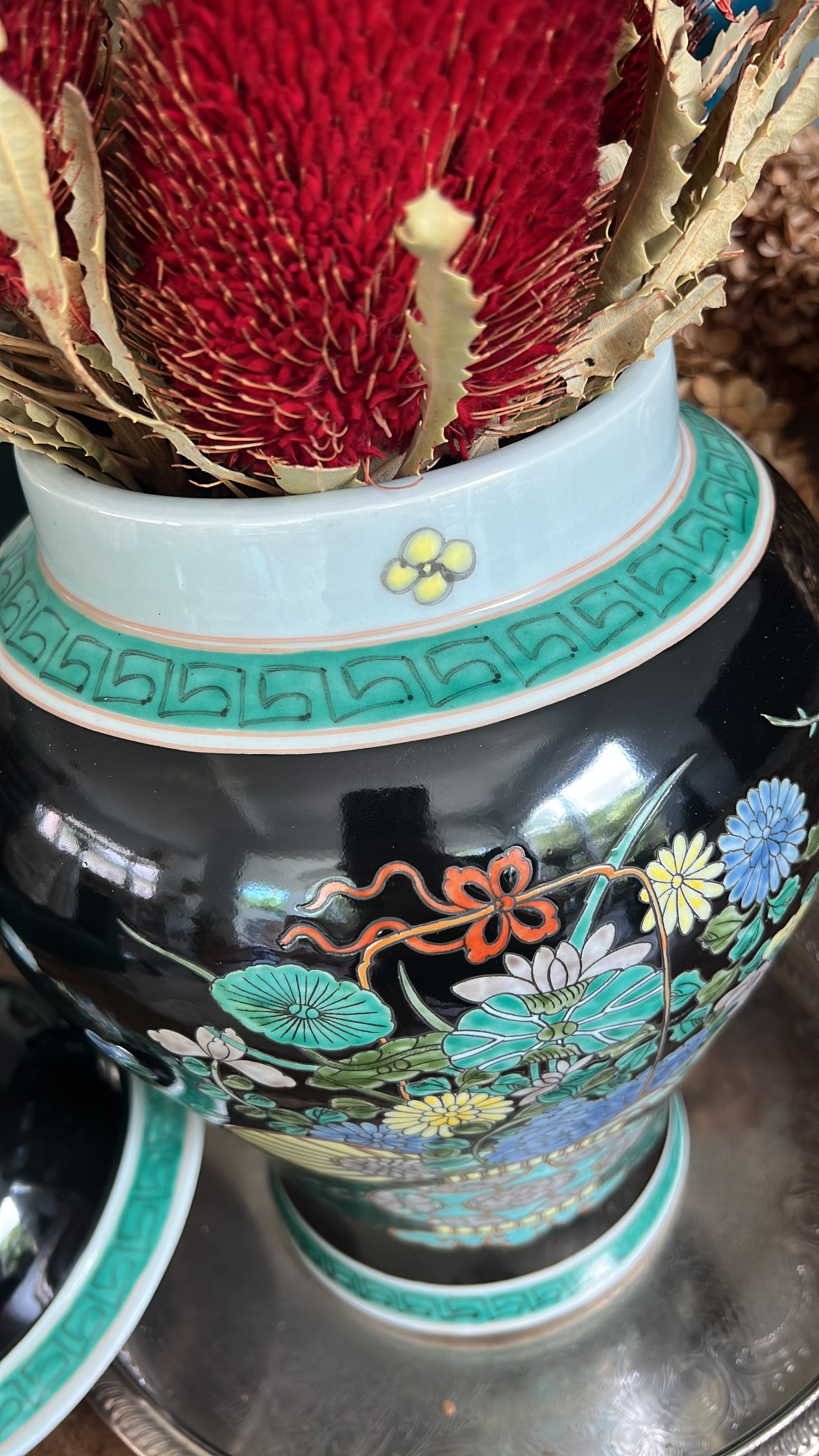 Beautiful black 40cm temple jar, with hand-painted lush bouquet decor. Yellow and green shades. Lots of details.