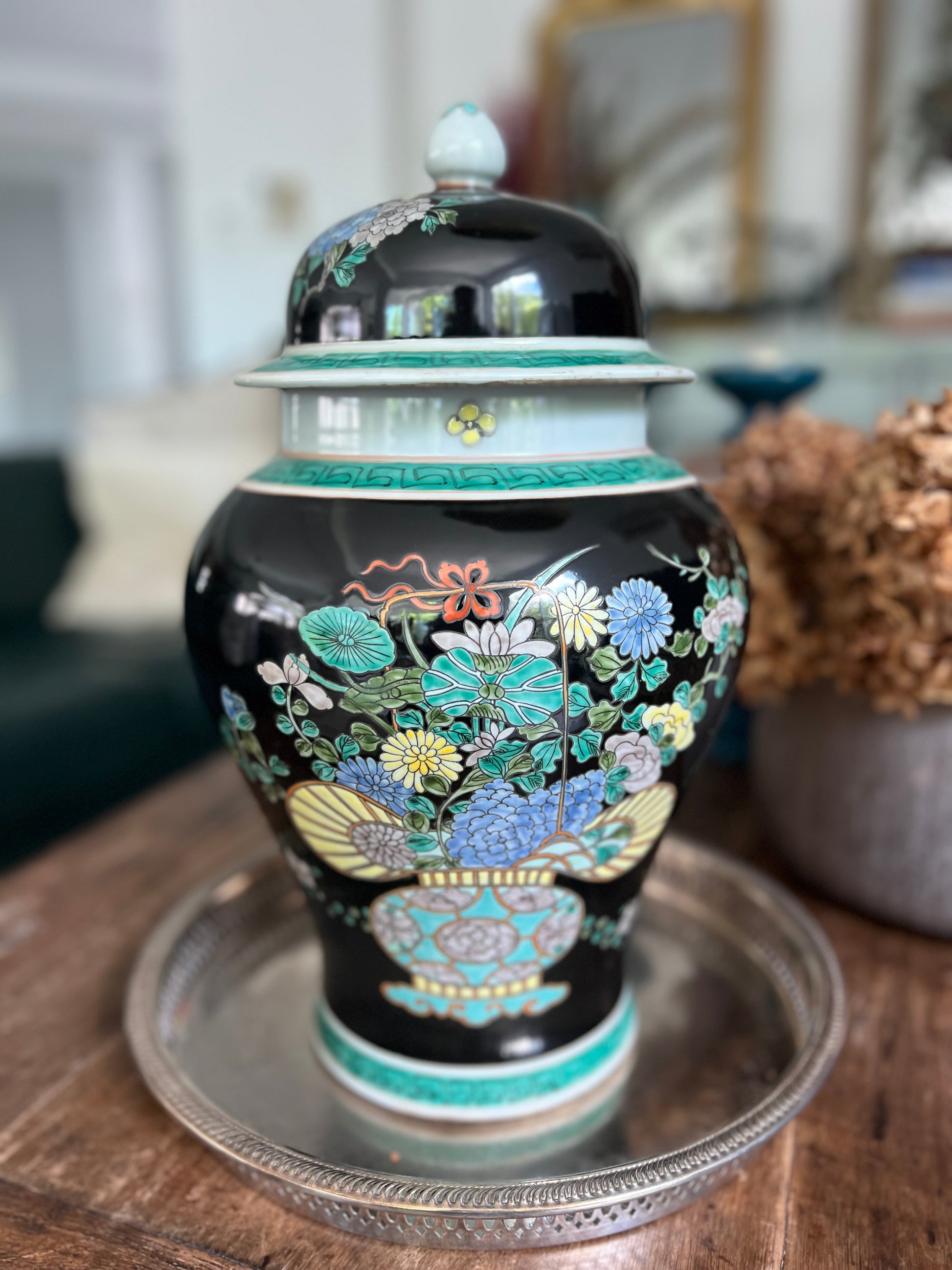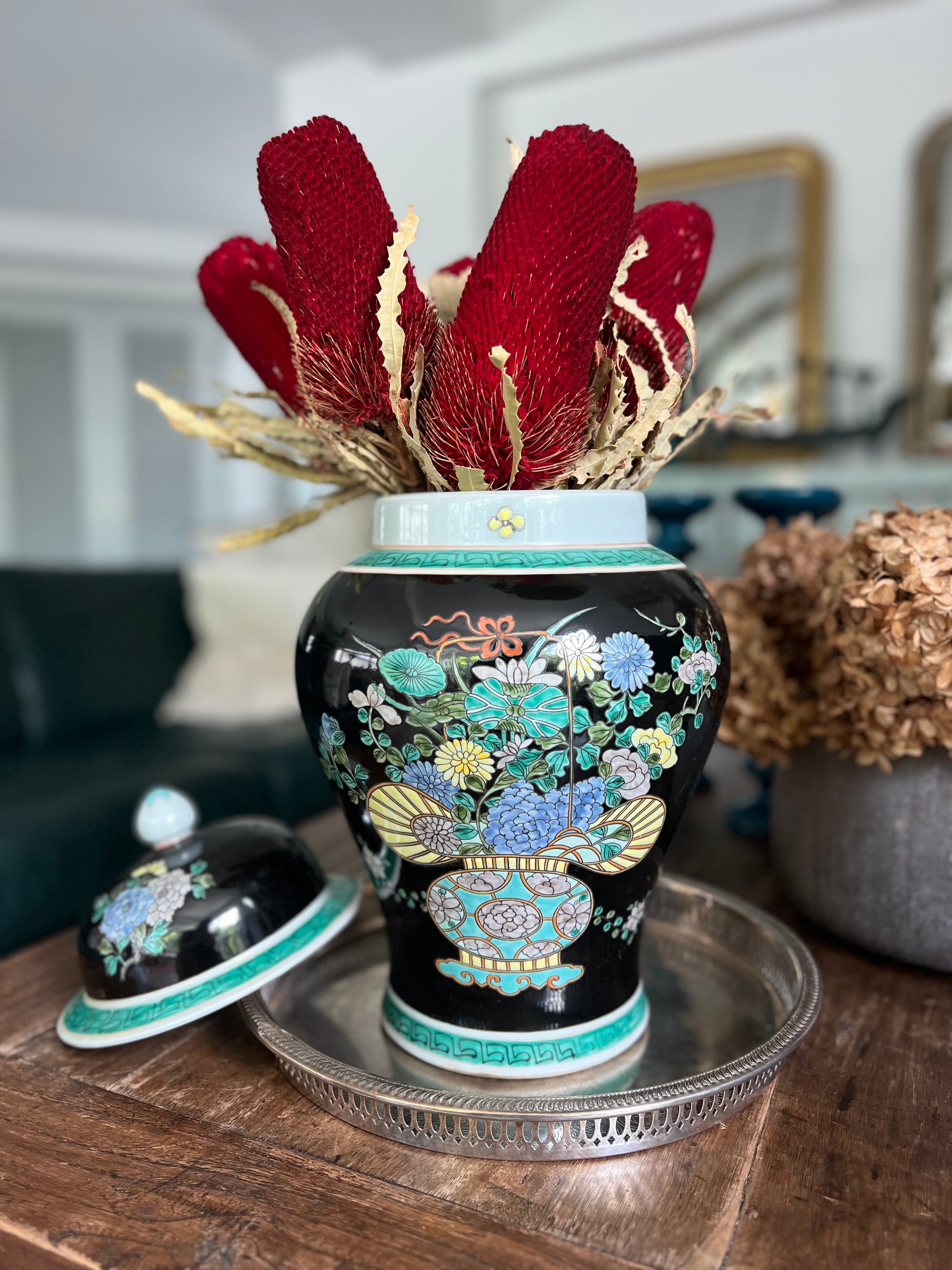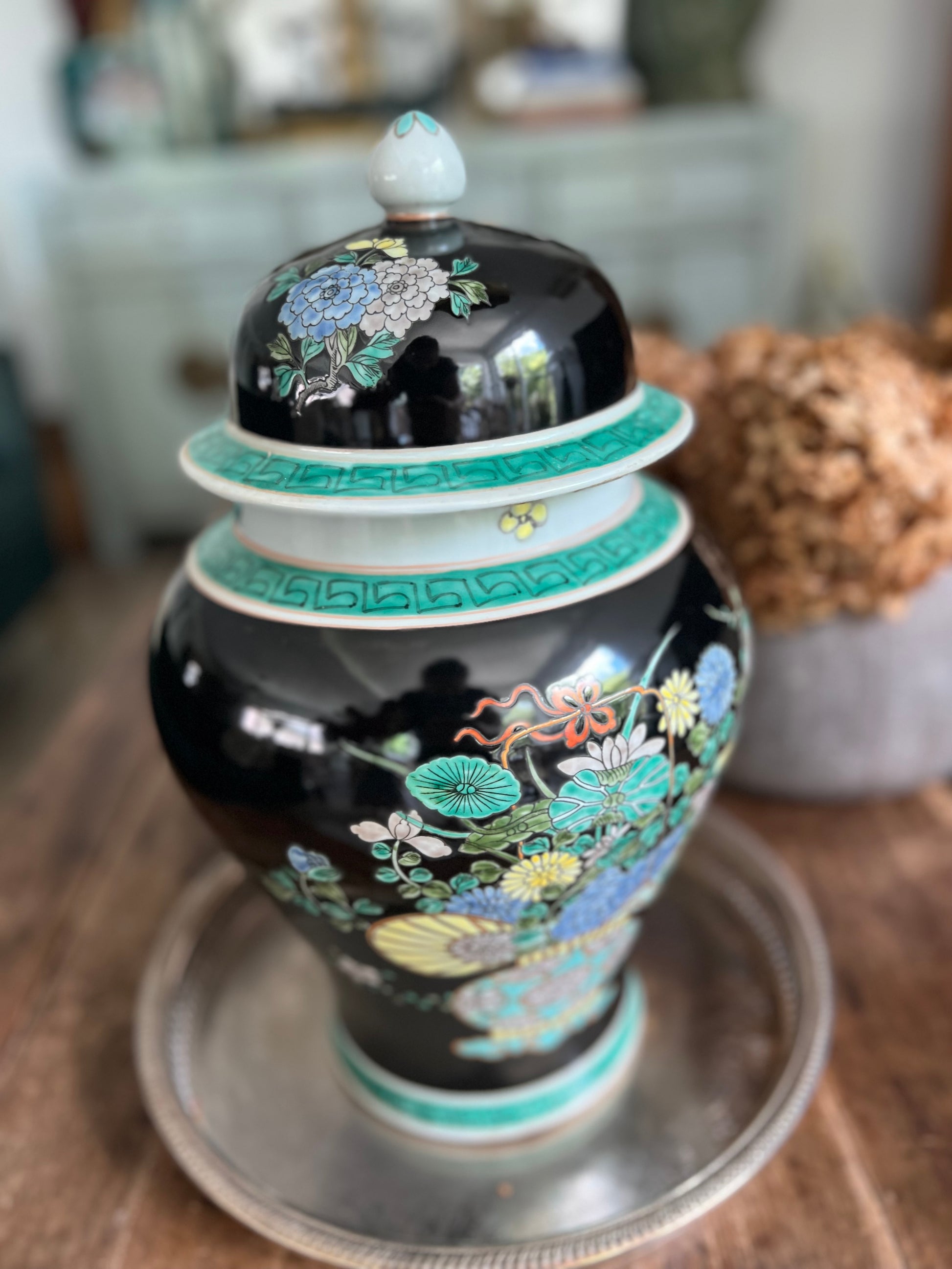 Beautiful black 40cm temple jar, with hand-painted lush bouquet decor. Yellow and green shades. Lots of details.