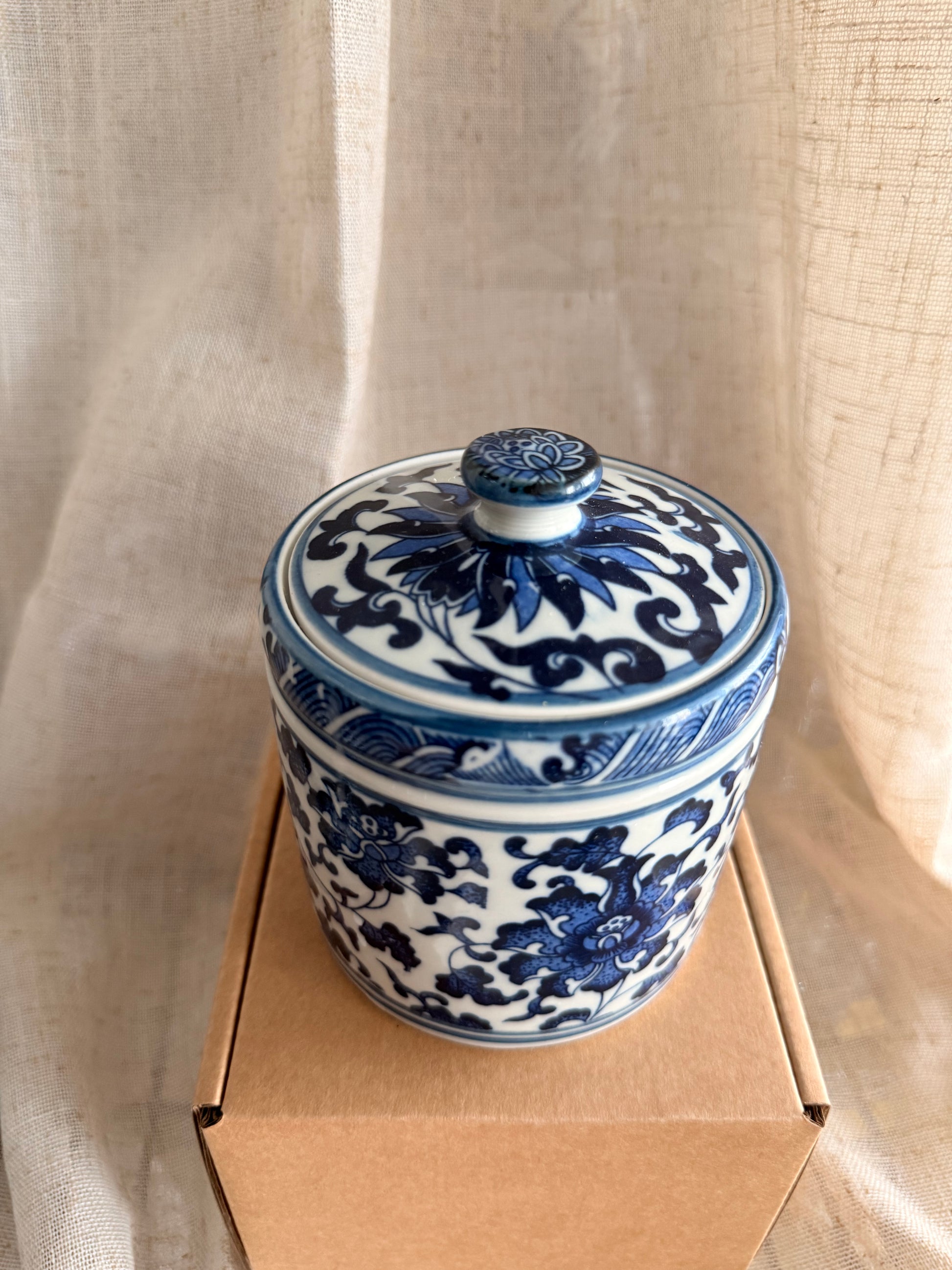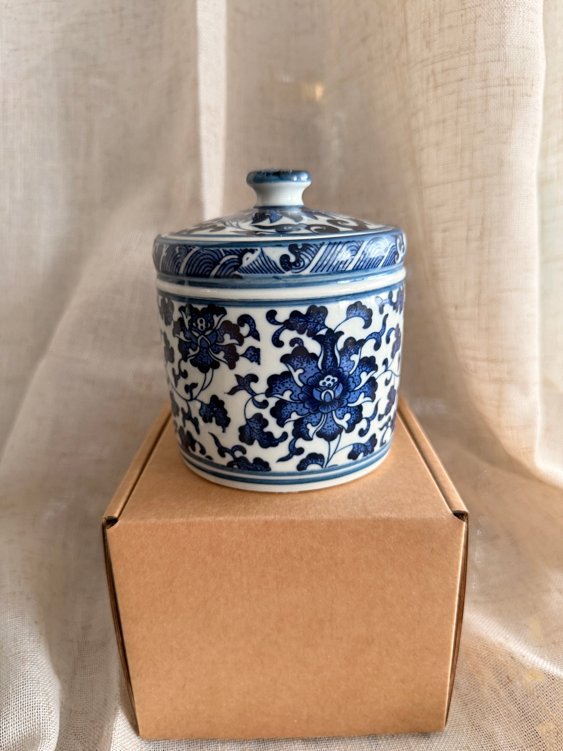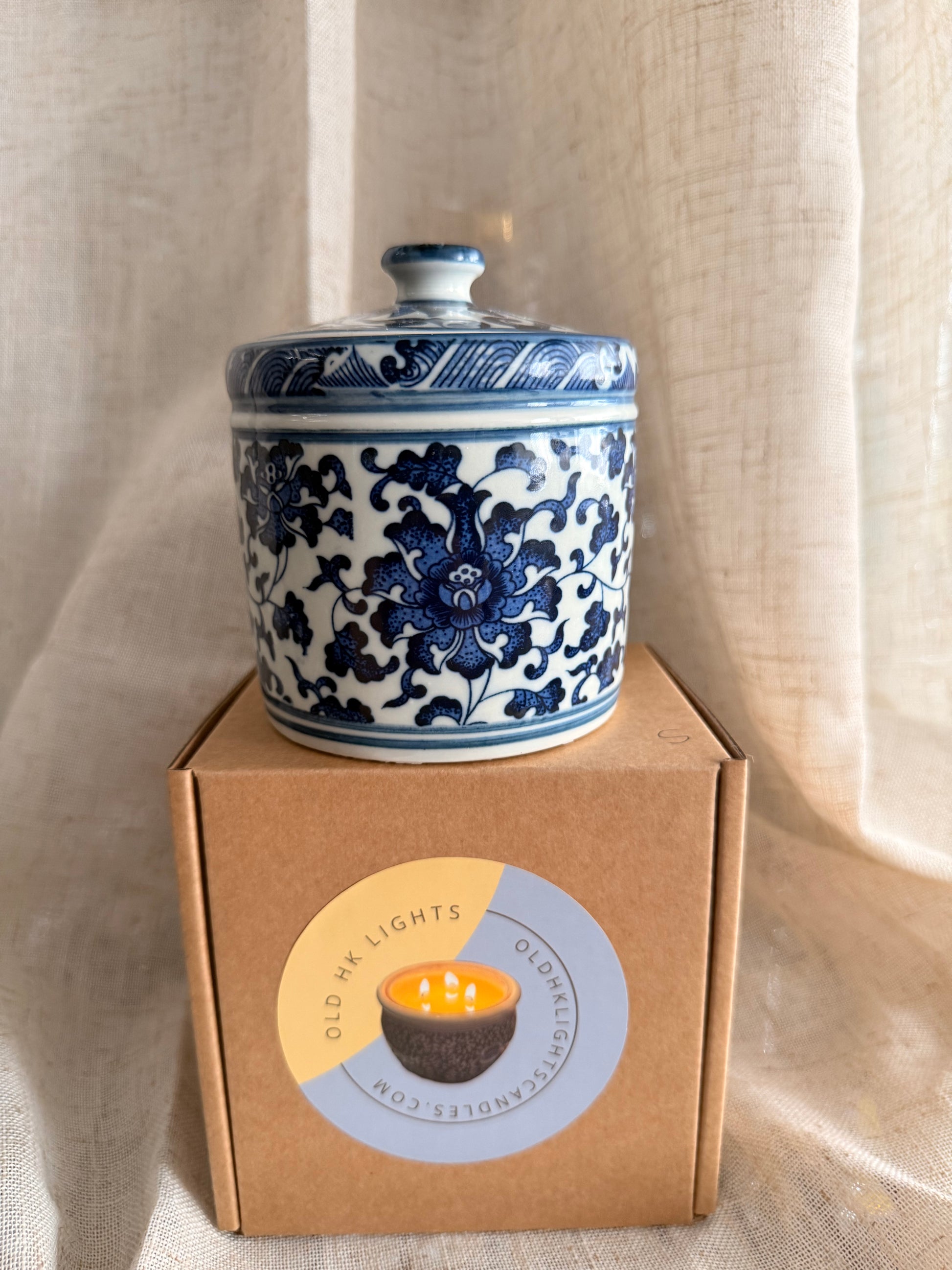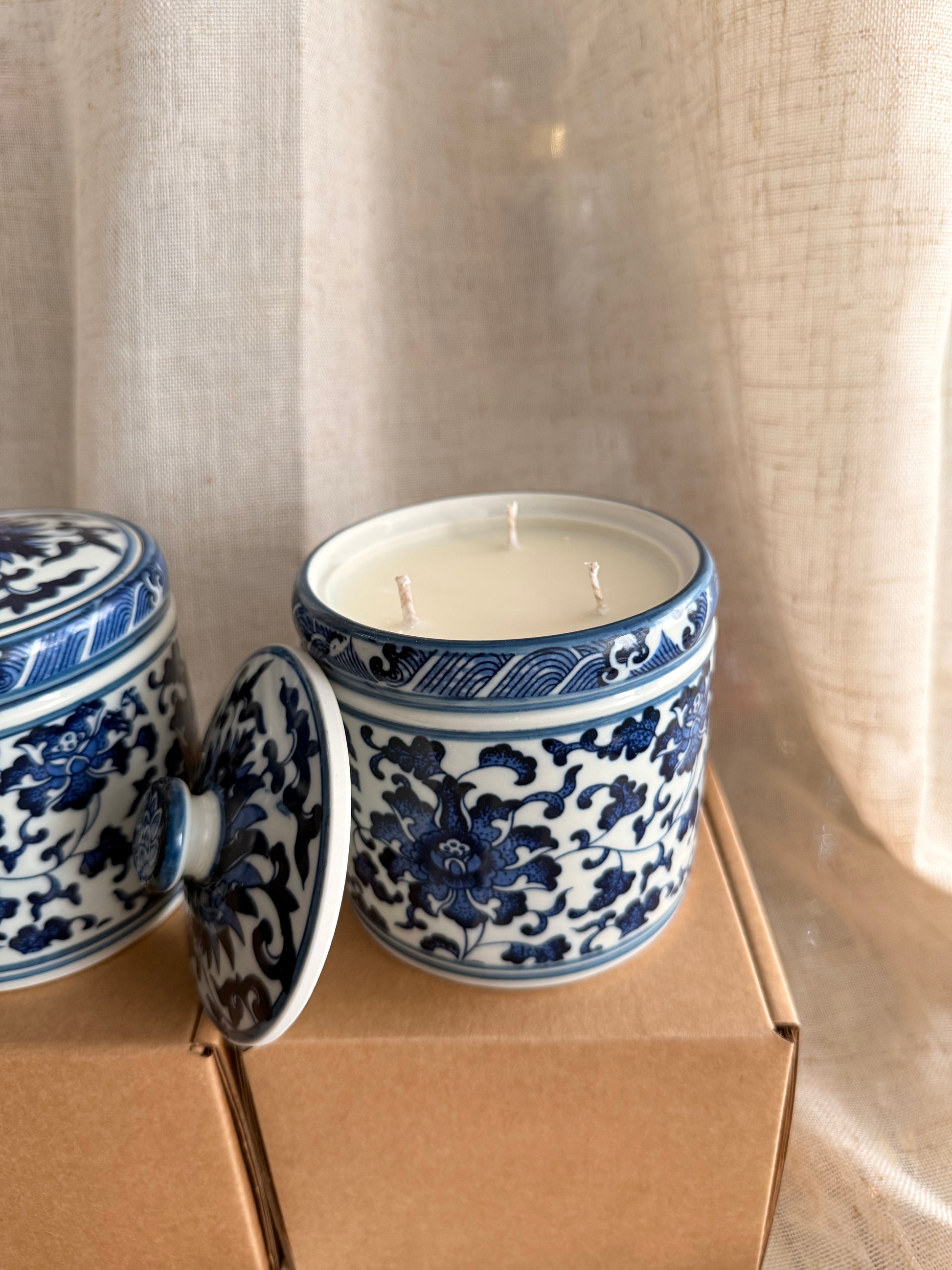 Chinese traditional medicine small jar, iconic blue and white, poured as 3 wicks candles. Those jars were used to store the dry medicine plants.
