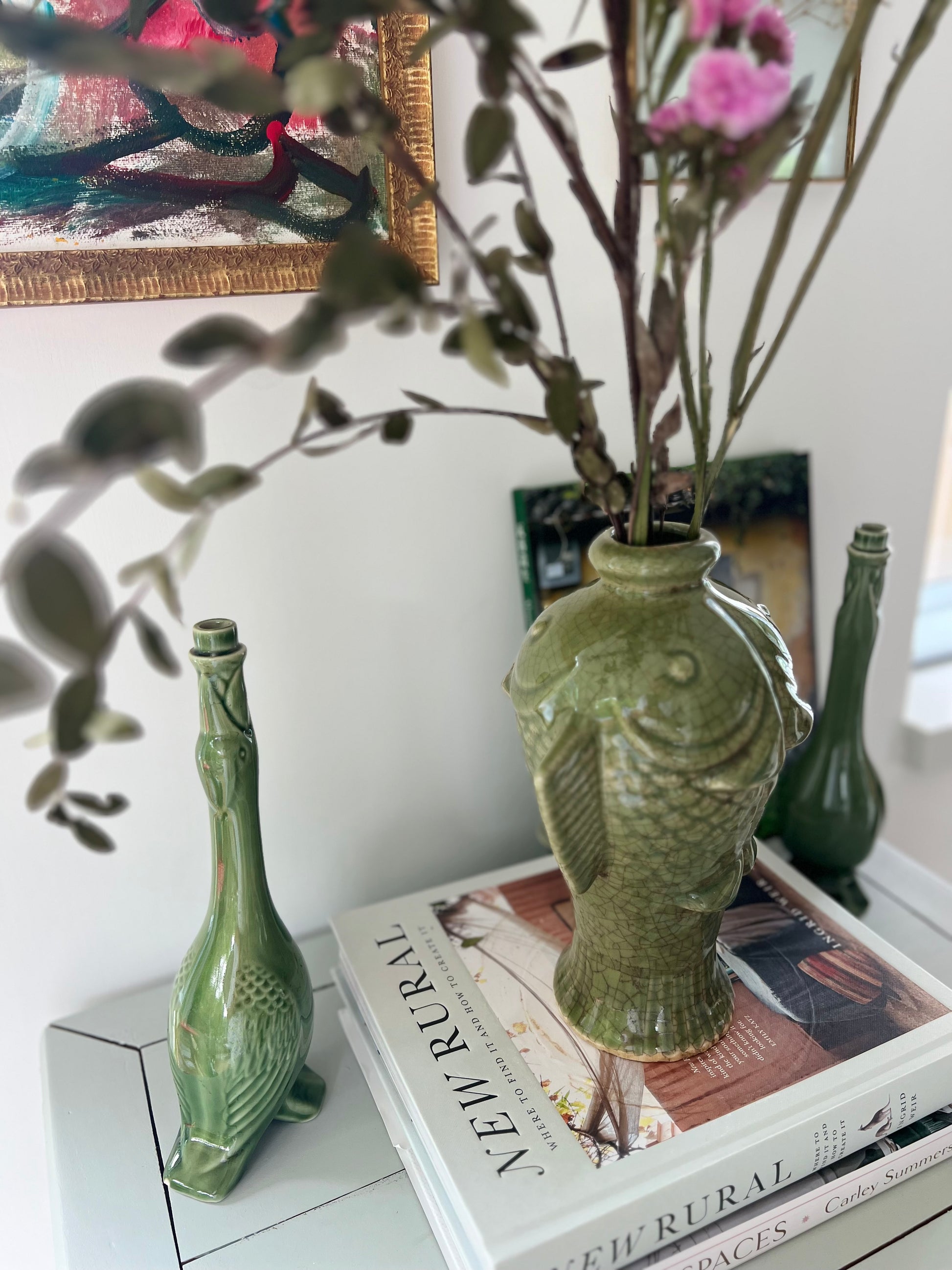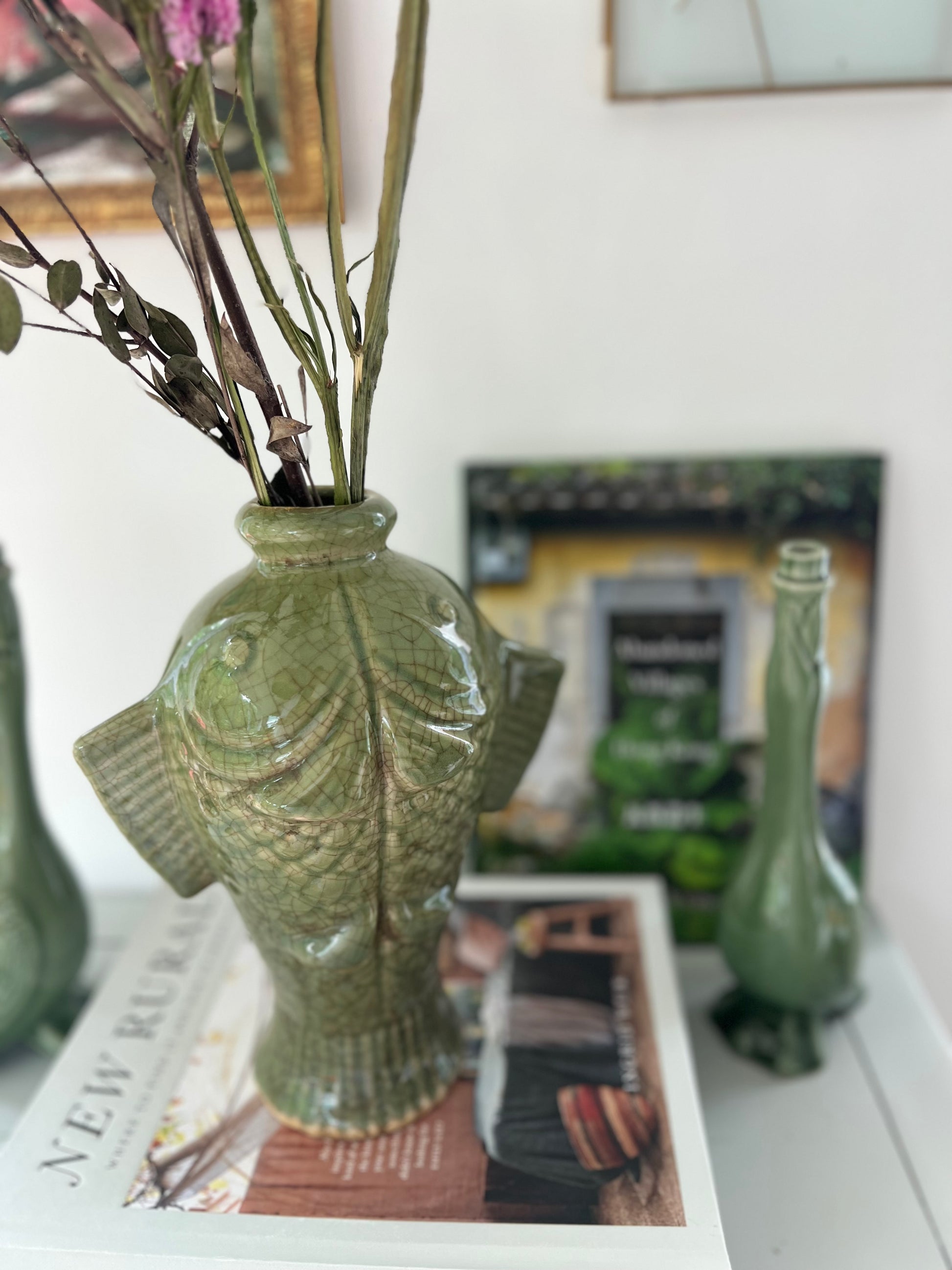 NB this product only consists in a green glaze fish vase. All other elements of decor are for presentation only, and may be found in the “Decor with a Soul” section of this website.