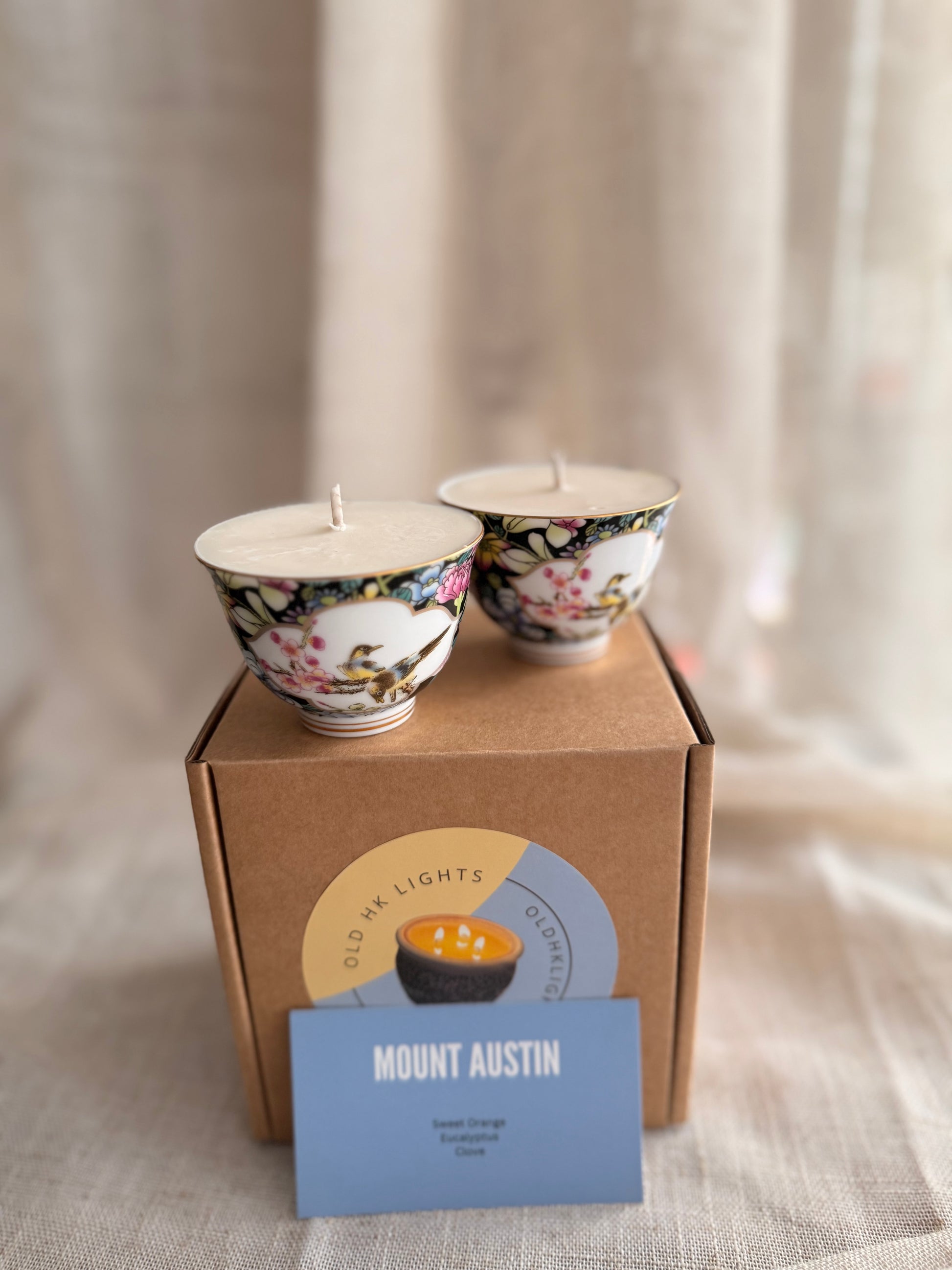 Vintage ceramic pair of teacups, poured as 1 wick candles. Very pretty and delicate bird and flowers pattern.