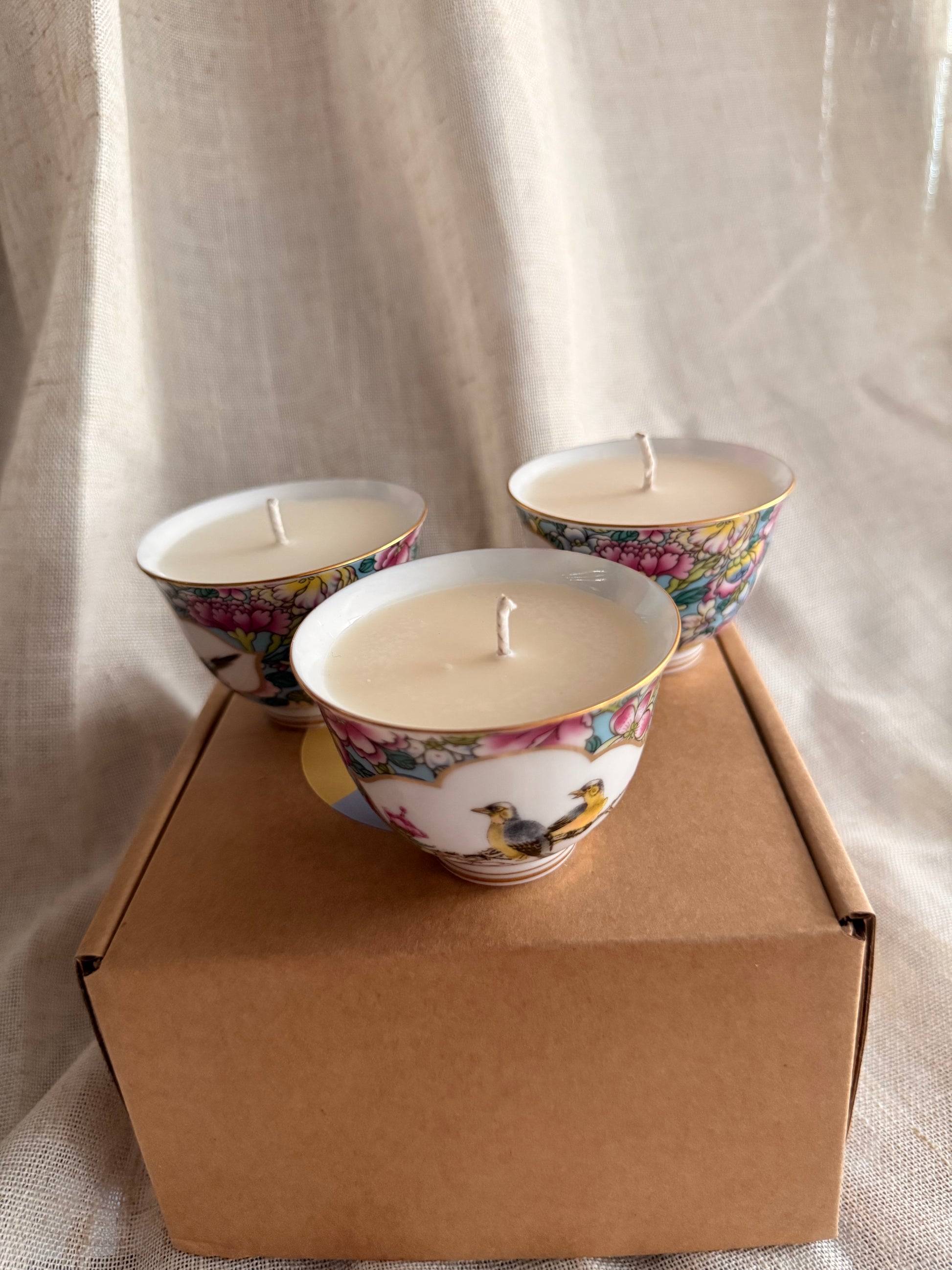 Set of 3 vintage porcelain teacups. The flower and bird pattern is gorgeous and so delicate.
