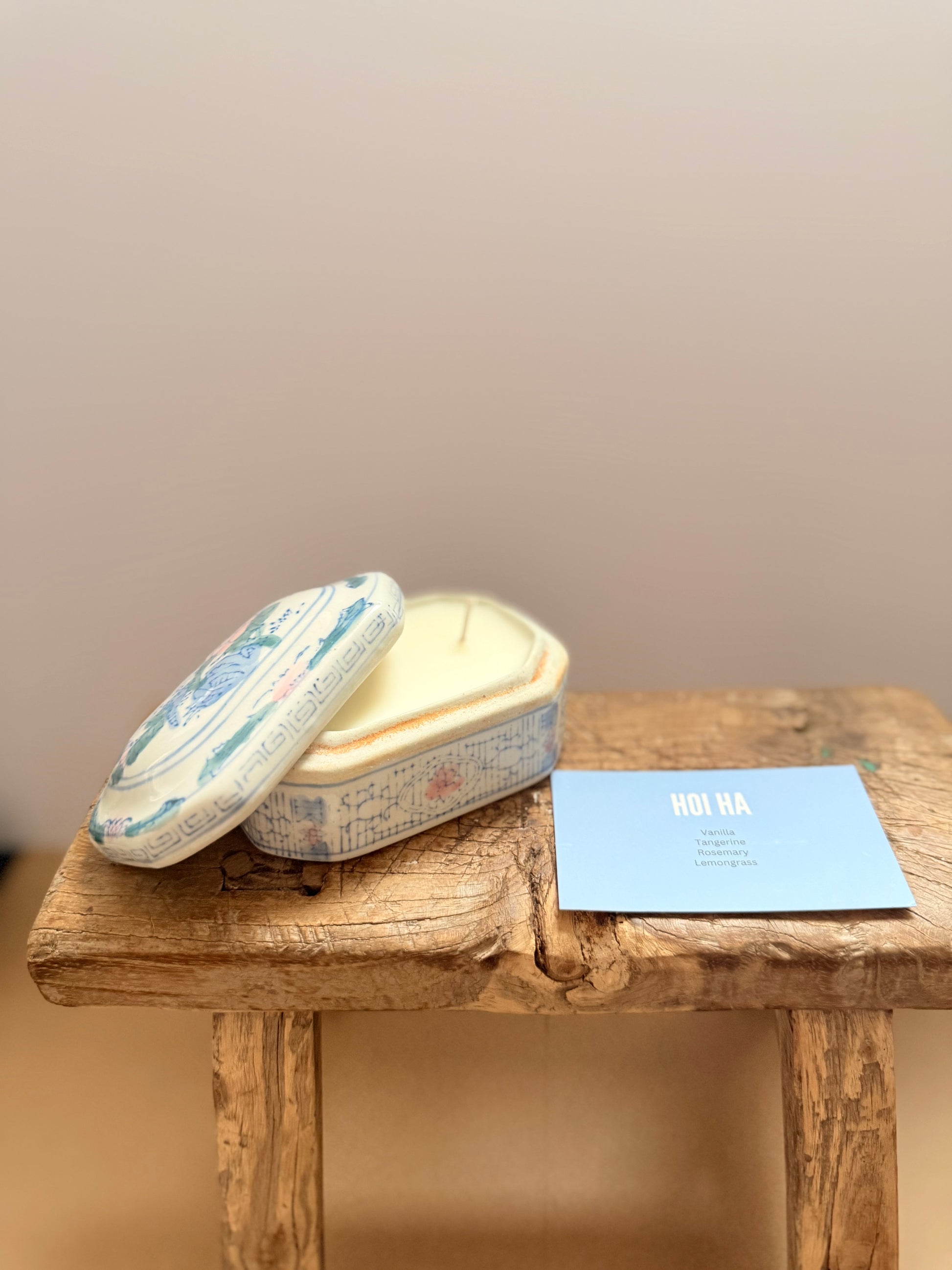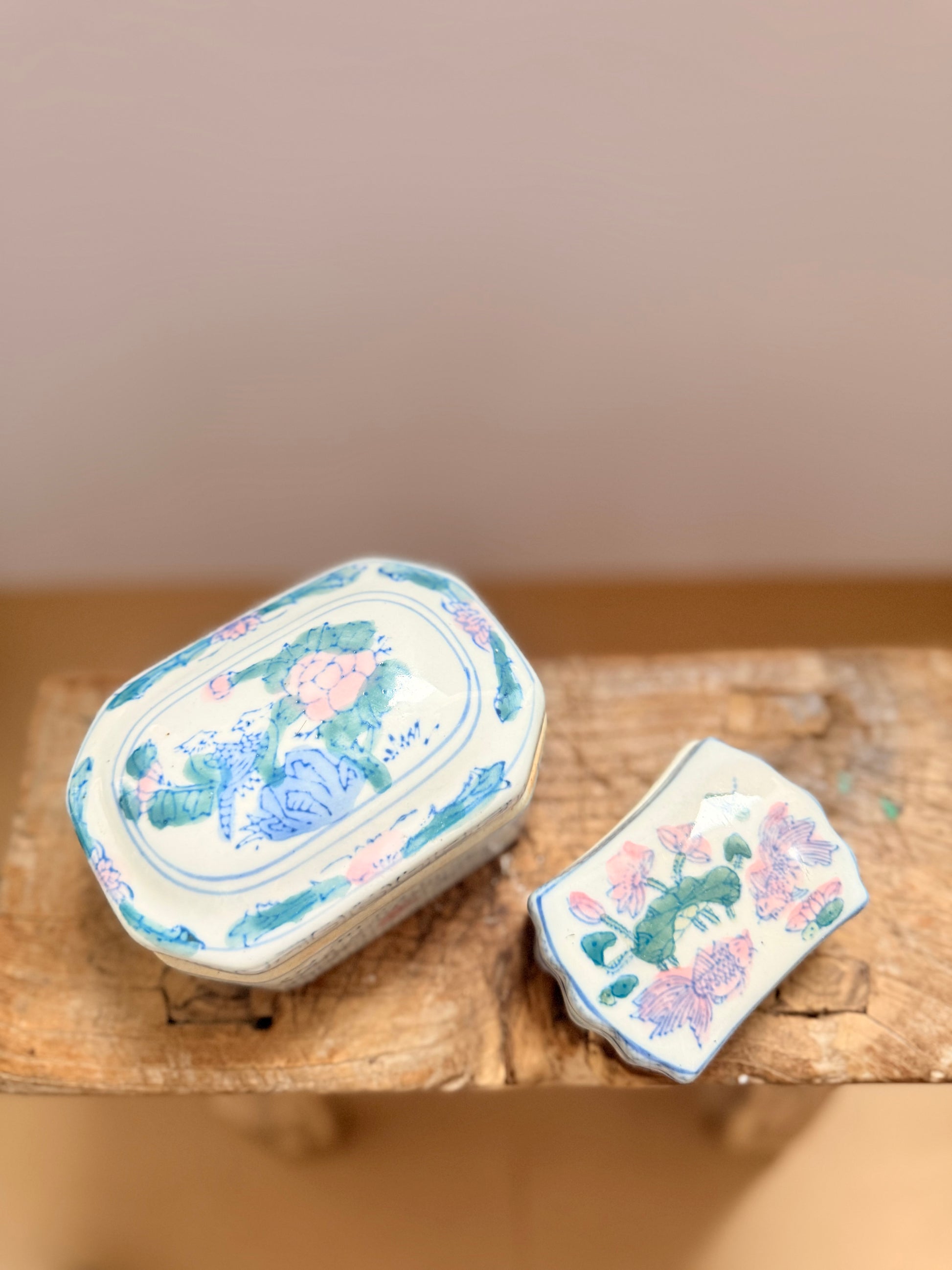 Small vintage porcelain cream box, showing a cute and delicate pastel floral pattern, poured as a 2 wicks candle. This type of box was used for handmade cream and lotions.