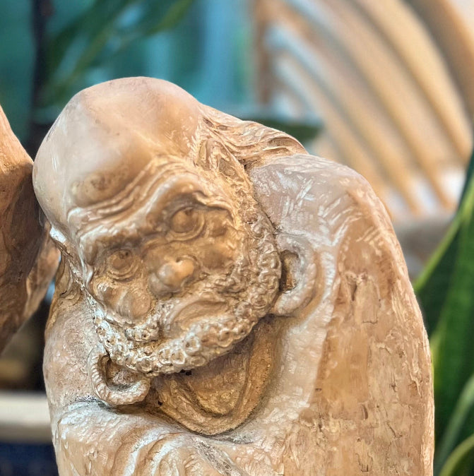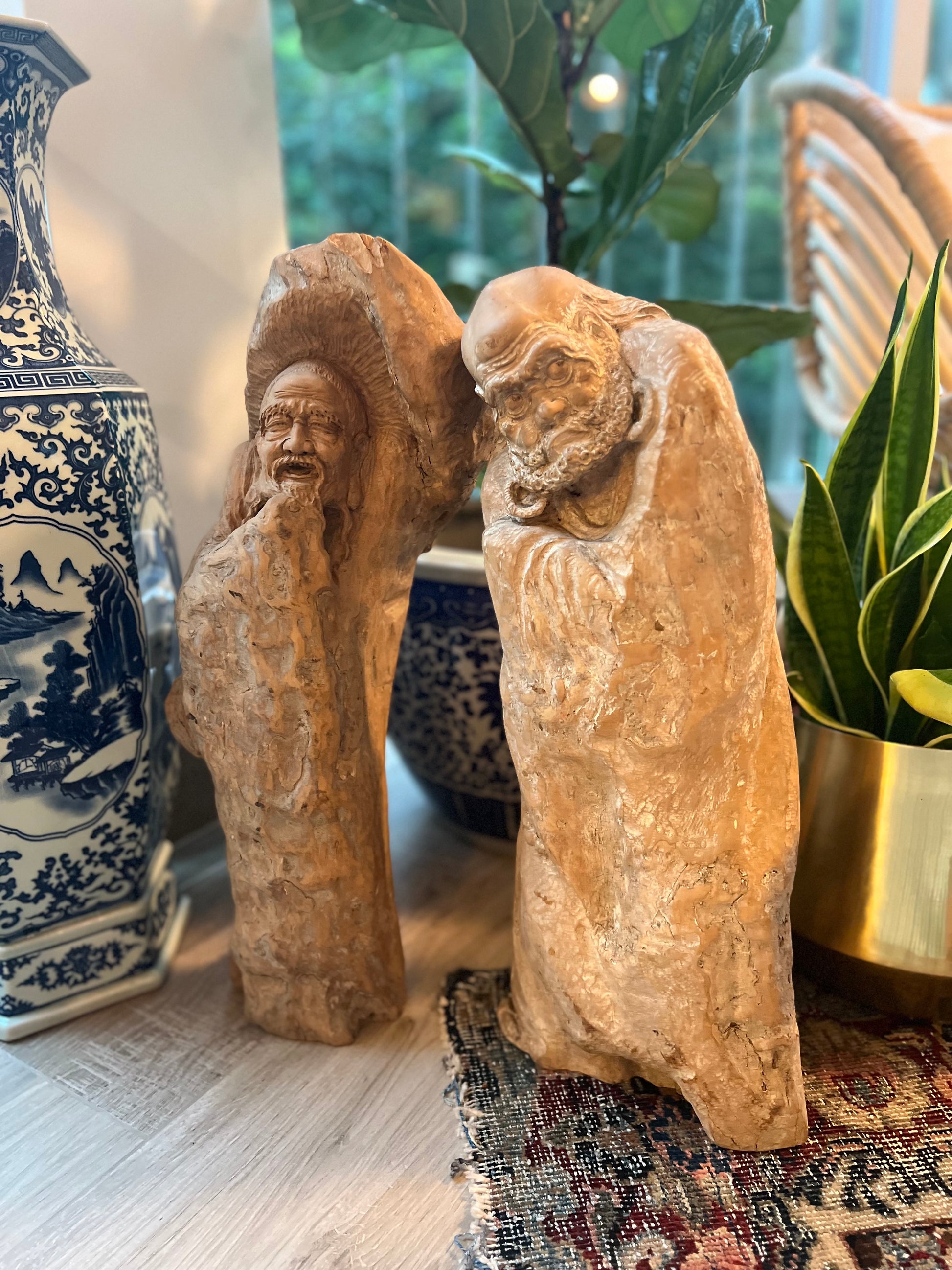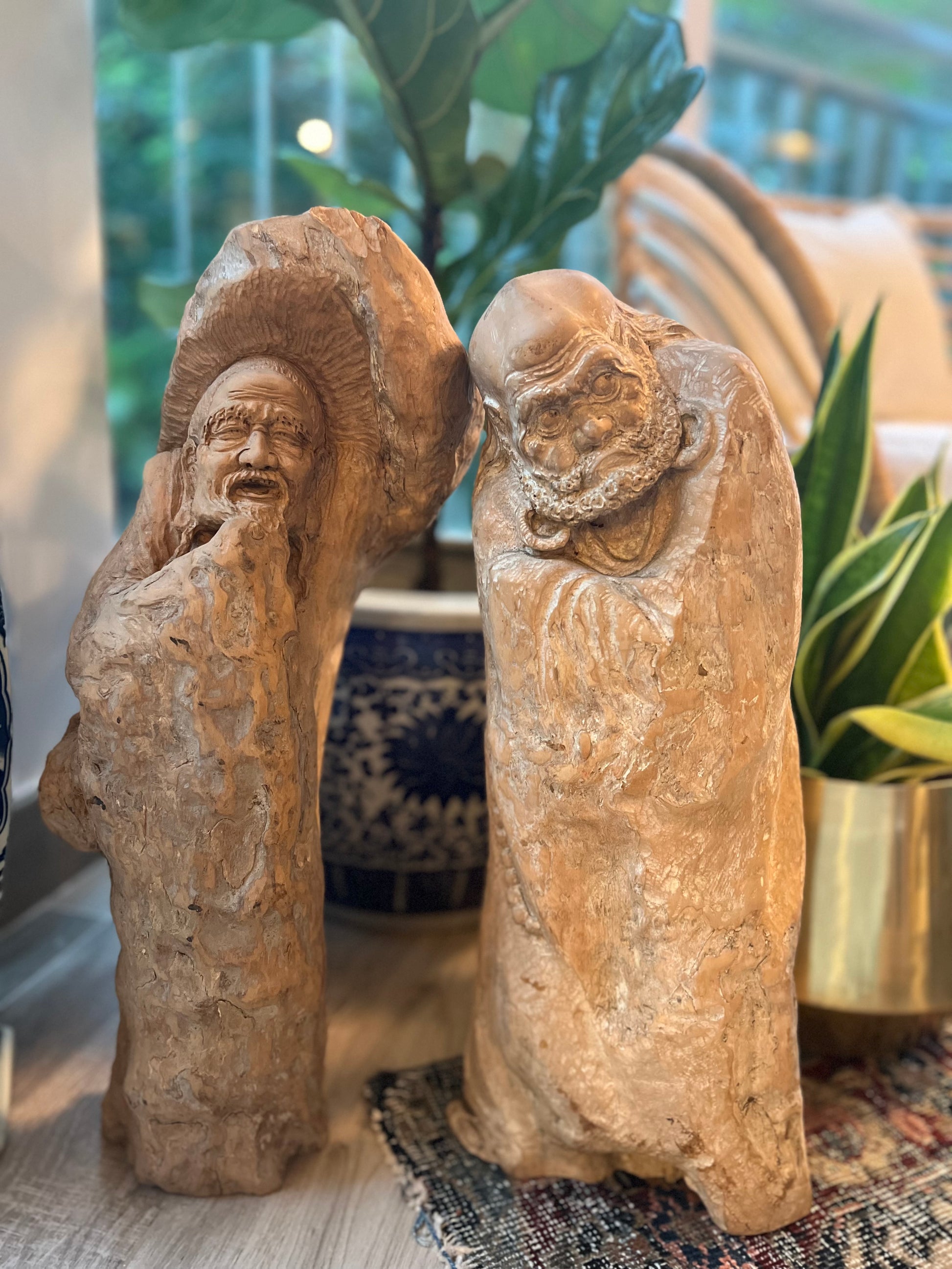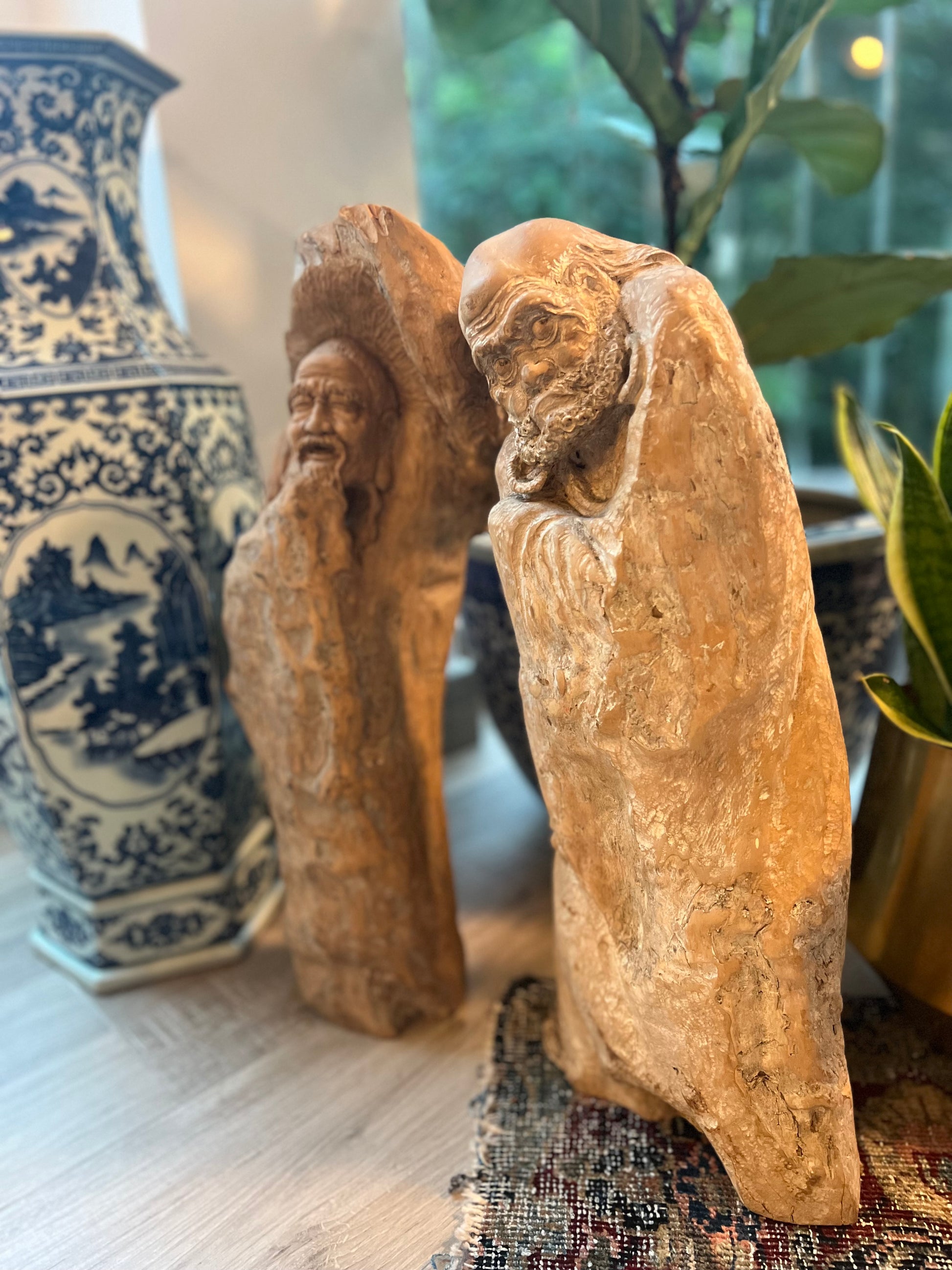 They’re each made of a single piece of wood, and show a very expressive and detailed hand carving work. Each statue is about 45cm tall.